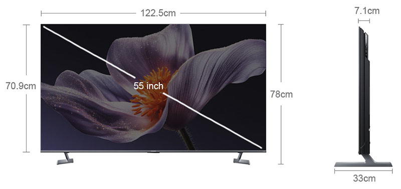 Kích thước không chân, treo tường: Ngang 122.5 cm – Cao 70.9 cm – Dày 7.1 cm