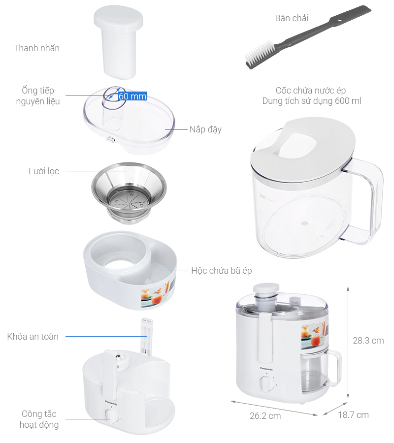 – Cốc chứa nước ép dung tích 0.6 lít và bình chứa bã dung tích 0.5 lít làm từ chất liệu nhựa an toàn, dễ vệ sinh.