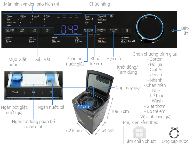 – Đặc biệt là có 12 chương trình giặt nhằm đáp ứng tối đa nhu cầu sử dụng khác nhau của người tiêu dùng cụ thể các chương trình bao gồm: chăn mền, chương trình I-Wash, giặt AI, vải lụa, giặt nhanh, giặt nhẹ, giặt thơm, vệ sinh lồng giặt, đồ cotton, đồ jean, đồ thể thao, đồ trẻ em.