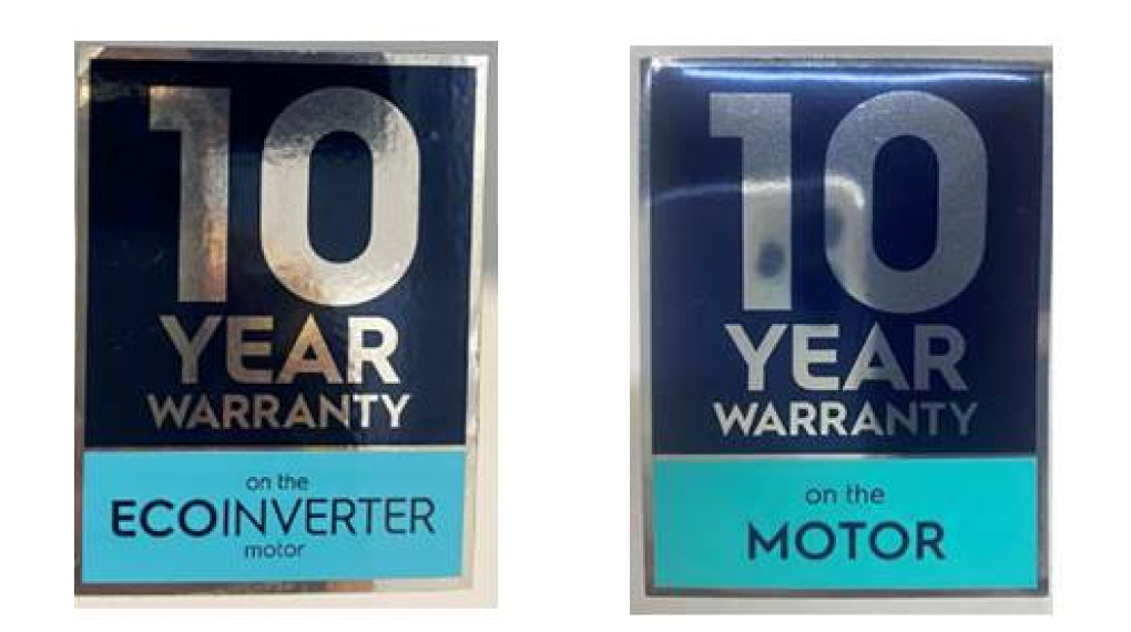 Lưu ý:Sản phẩmEWF9025DQWBsẽ có 2 mẫu sticker hiển thị khác nhau MOTOR & ECOINVERTER, Electrolux cam kết đảm bảo thời gian bảo hành động cơ 10 năm cho khách hàng theo đúng chính sách.