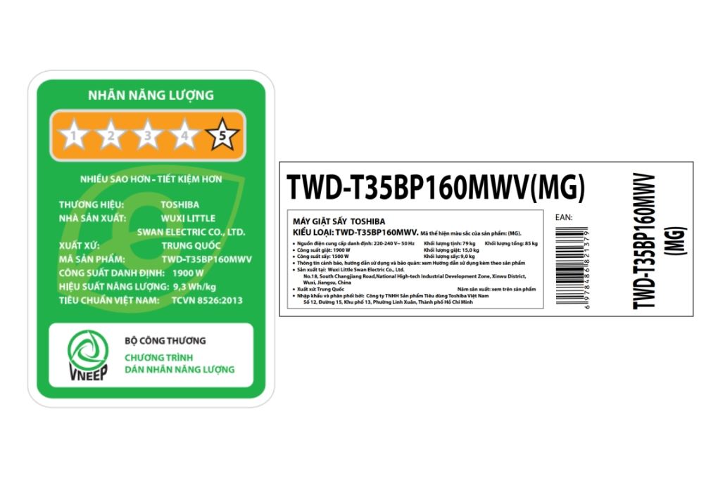 Thông số kỹ thuật Máy giặt sấy Toshiba Inverter giặt 15 kg – sấy 9 kg TWD-T35BP160MWV(MG)