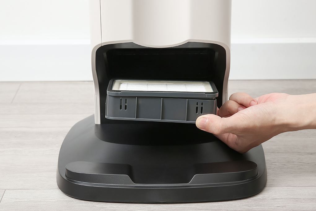 Hub trung tâm tiếp nhận rác từ thân máy và lưu trong túi kín khi máy tự hút – đổ bụi, không khí được lọc trước khi xả ra ngoài, giúp giảm phát tán hạt mịn tại dock và giữ khu vực sạc sạch sẽ.