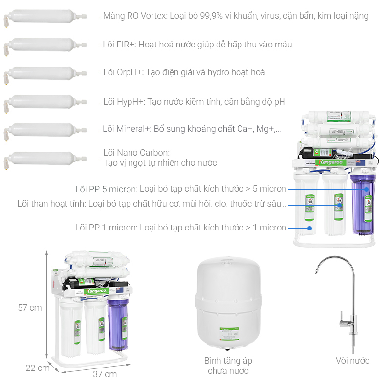 Lưu ý: Các thay đổi này chỉ thay đổi về mặt thiết kế, còn về nguyên lý hoạt động, dung tích bình chứa, chất lượng sản phẩm, vẫn không thay đổi. Khi khách hàng mua sản phẩm máy lọc nước RO Hydrogen Kangaroo KGRP09HQ 9 lõi tại Điện máy XANH sẽ được giao mẫu ngẫu nhiên.