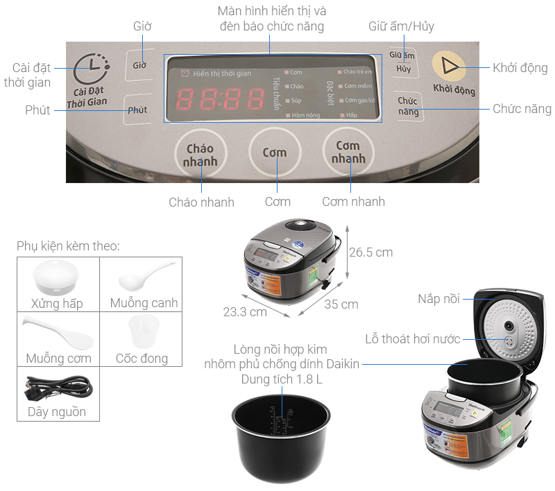 – Dung tích 1.8 lít, nấu được 8 – 10 cốc gạo kèm nồi, phù hợp gia đình 4 – 6 thành viên.