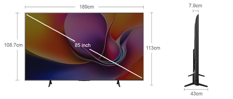 Kích thước có chân, đặt bàn: Ngang 189.0 cm – Cao 113.0 cm – Dày 43.0 cm