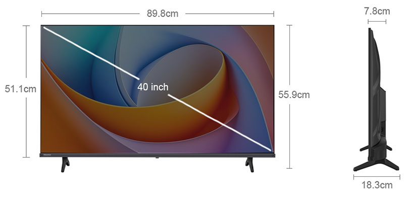 Smart Tivi Hisense 40A4Q có thiết kế hiện đại với viền nhựa mỏng, mang lại cảm giác mở rộng không gian hiển thị.Màn hình 40 inchphù hợp cho các không gian vừa và nhỏ như phòng ngủ, phòng khách chung cư hay văn phòng cá nhân. Đây là kích thước lý tưởng cho những căn phòng có diện tích từ10 đến 15m², với khoảng cách xem lý tưởng từ 2.0 đến 3.2m, giúp bạn trải nghiệm hình ảnh sắc nét mà không gây mỏi mắt.