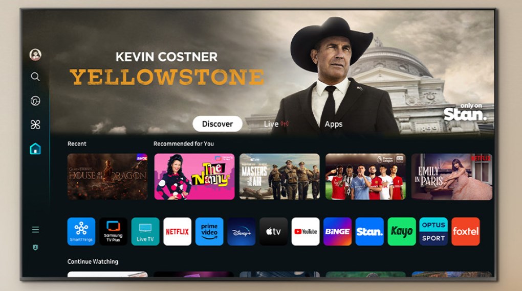– Hệ điều hànhTizen™của tivi Samsung có giao diện hiện đại, phần mục được sắp xếp thuận mắt, giúp bạn dễ dàng nhận diện và tìm kiếm nội dung yêu thích. Kho ứng dụng phong phú bao gồm các ứng dụng phổ biến như YouTube, Netflix, Clip TV, FPT Play, MyTV, VieON, Spotify và nhiều ứng dụng thú vị khác.