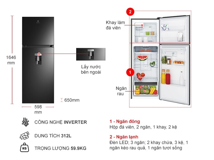 Tủ lạnh Electrolux ETB3440M-Hđược trang bị rất nhiều công nghệ và thiết hiện đại cải tiến như lấy nước ngoài, ngăn đông mềm, ngăn đá trên,… đều sẽ giúp cho thực phẩm được bảo quản tối ưu, đem đến trải nghiệm sử dụng tốt cho người dùng.